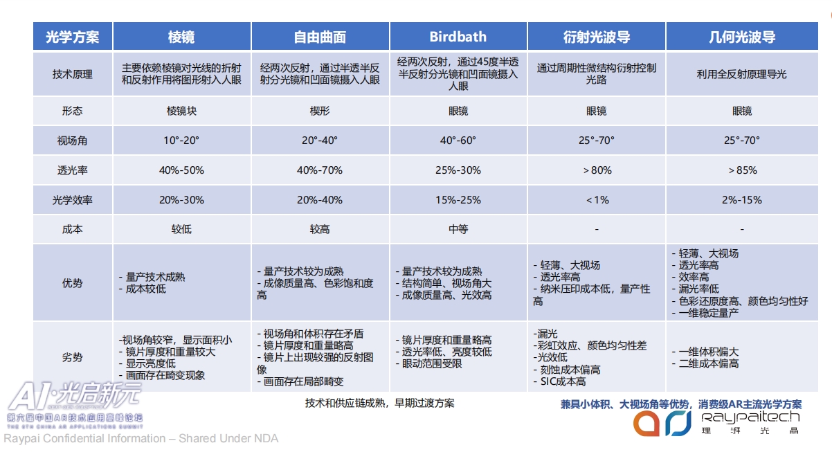 从2012年的棱镜方案,到目前以单色纳米压印为主流的衍射光波导方案,再到Meta 即将发布的全彩阵列方案,我们可以看到行业发展趋势是从可用到可佩戴的路径持续演进。光波导方案分为衍射和阵列,由于光波导方案具备体积、形态以及透过率等性能方面的优势,成为了目前大家所关注的焦点以及现阶段产品的主流方向。
