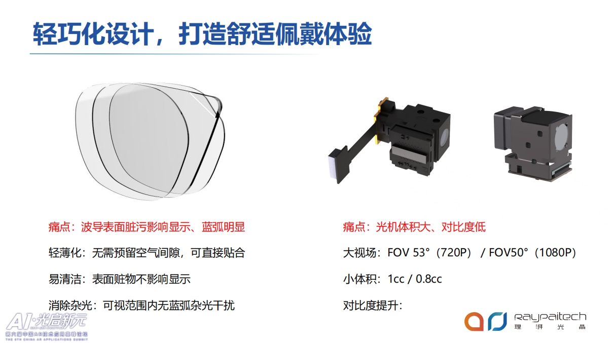 另外在波导这一块,大家会担心几何波导脏污怎么办?脏污会影响显示性能,整机组装也会受到一定影响。理湃也做了相应技术的沉淀和积累,当然现在还未对外开放产品的,但现阶段的产品不需要再留空气,镜片表面不需要留空气gap,可以直接进行浮胶贴合,而且表面的脏污不会再影响显示性能,同时在我们新方案当中,可以消除可视范围内的蓝弧等杂散光的干扰,整个画面相对而言会比较干净。