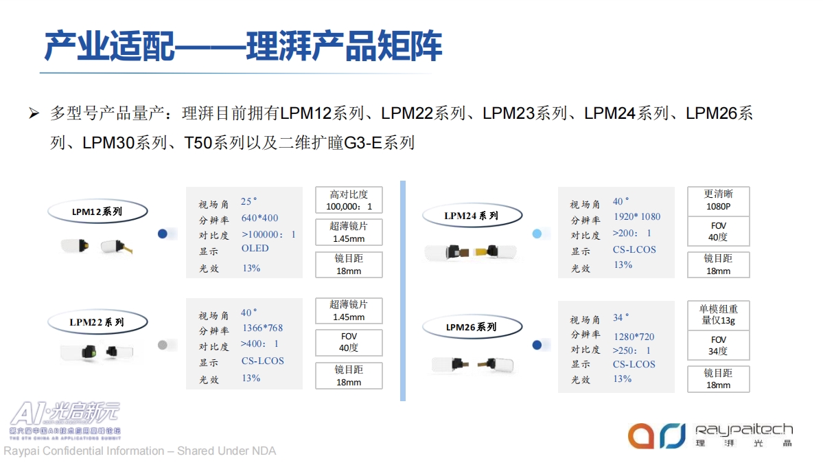 我们的第二款新品是大视场产品,目前可以做到入眼亮度500nits时功耗500毫瓦。这要重点提下为什么这款产品的亮度会偏低,原因是FOV越大,效率天然就是越低的。还有一款产品是 LCTA 50,可实现50°超大视场角,1080P高分辨率,光机0.8cc超轻方案。以上是全部演讲内容,谢谢。