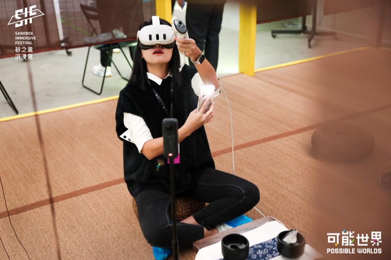 此外,还有以粉色马桶充当座位的《跌入虚拟世界的 i人少年》(First Virtual suit),在其中能切换不同外貌、身份的虚拟化身;《身体|共舞》(Collective Body)的大场景允许用户踩踏甚至躺在松软的棉垫上,获得模拟雪地触感的同时放松身心;以日式茶道文化为主题、将VR手柄与茶杯绑定的《禅》等等,场景搭建和实际体验都颇具特色。