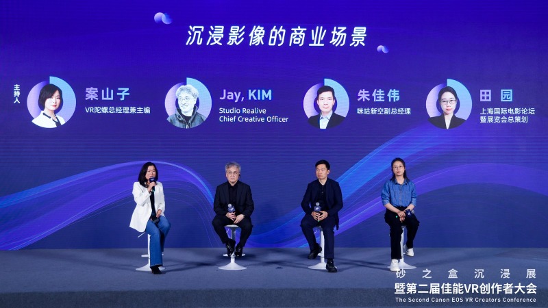 本次活动中,VR陀螺总经理兼主编案山子主持了“第二届佳能VR创作者大会”的圆桌对话。她与Studio Realive Chief Creative Officer Jay, KIM ,咪咕新空副总经理朱佳伟,上海国际电影论坛暨展览会总策划田园三位嘉宾,共同围绕“沉浸影像的商业场景”主题进行了深入探讨。