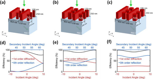 图源:optica(三区耦合器配置的超表面设计:(a)-(c)分别为区域 1-3 的超表面几何形状;(d)-(f)超表面设计(a)-(c)的效率曲线,其中红色曲线表示一级衍射效率随入射角从 -10° 到 10° 的变化,蓝色曲线表示零级反射效率随二次入射角从 41.2° 到 62.5° 的变化,黑色曲线是两种效率之和。)