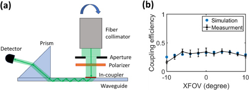 图源:optica(超表面耦合器耦合效率的测量:(a)测量耦合效率的实验装置;(b)沿 XFOV 测量的耦合效率。)