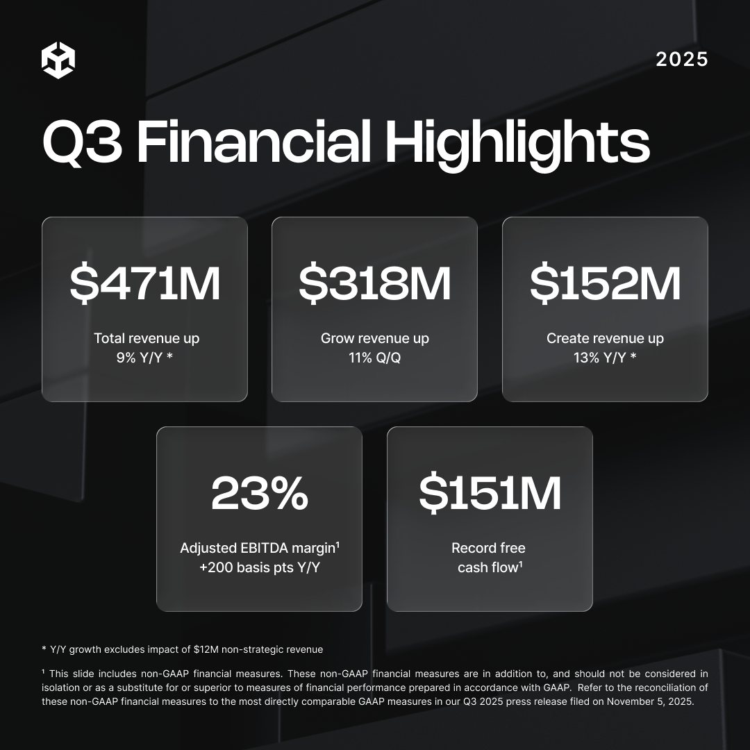 Unity今日发布2025财年第三季度财报,除部分业务外整体表现稳健,其中Create Solutions和Grow Solutions两大业务板块均实现超预期增长。季度总营收达4.71亿美元,同比增长5%。