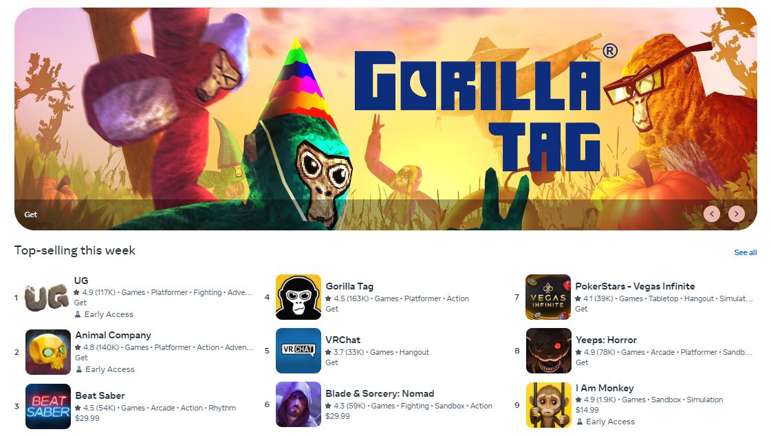《Gorilla Tag》不仅在畅销榜常常霸榜,其独特的游戏玩法和创意也带动了一大批争相模仿者,上图的当周畅销榜中:《UG》《Animal Company》《Yeeps: Horror》以及数日前刚发布的《I Am Monkey》都在一定程度上借鉴了《Gorilla Tag》的运动机制或游戏元素。