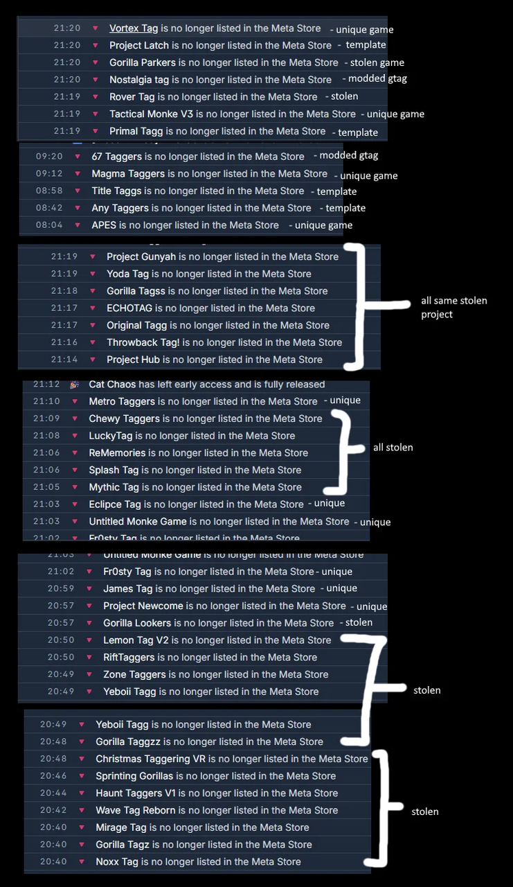 不过,据QuestStoreDB(第三方数据库)显示,Meta Horizon商店似乎在进行一场大规模下架行动,通过之前的数据库动态来看,已有超过一百款《Gorilla Tag》的山寨游戏已被移除。