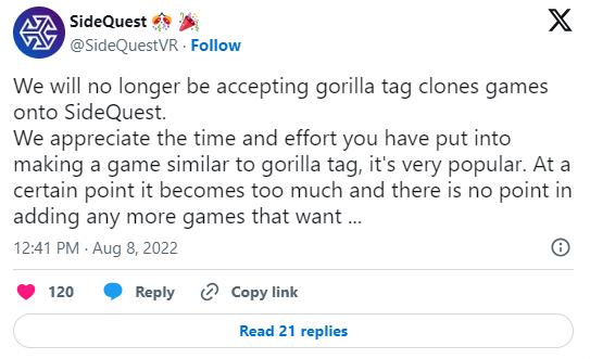 2022年,VR侧载平台SideQuest就专门针对《Gorilla Tag》山寨游戏发布了一则声明:“我们很感谢你们投入时间和精力来制作一款类似《Gorilla Tag》的游戏,它非常受欢迎,但同类游戏泛滥到一定程度时,再添加更多模仿的作品已毫无意义。”