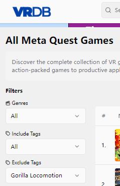 玩法借鉴对VR游戏来说并不陌生,长久以来,《Beat Saber》的模仿者也数不胜数。但也只有《Gorilla Tag》引发了最多的负面评价。不少玩家也放弃直接在Meta Horizon商店内检索,转而使用第三方数据库的应用筛选功能,例如在VRDB上,用户甚至可以直接筛选排除《Gorilla Tag》模式的游戏。