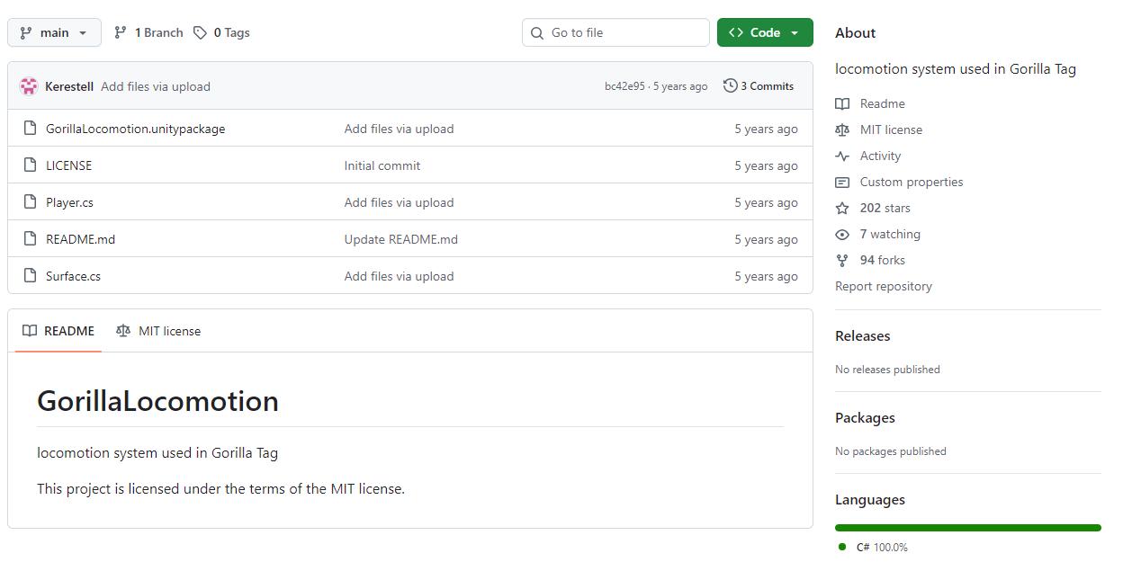 这款名为“GorillaLocomotion”的开源VR运动系统几乎可以“即装即用”,新手开发者在Unity中短时间内实现自然的攀爬、跳跃和摆动手感,做出一款“能动”的VR游戏。社区内也有不少玩家会发布视频教程教大家怎么做一款自己的《Gorilla Tag》山寨游戏。