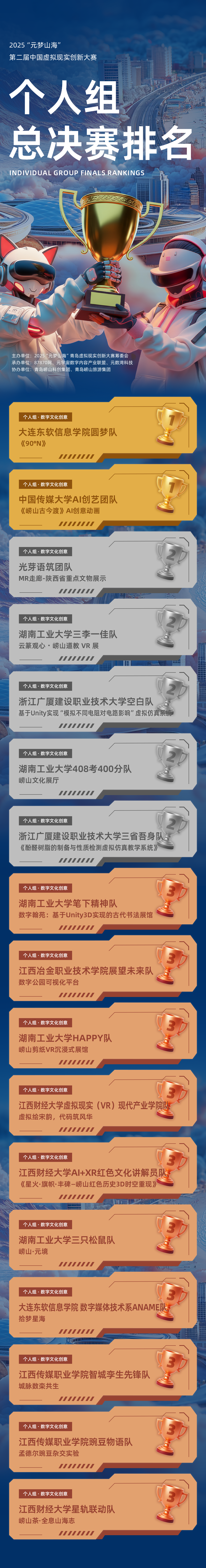 三等奖:湖南工业大学笔下精神队、江西冶金职业技术学院展望未来队、湖南工业大学HAPPY队、江西财经大学虚拟现实(VR)现代产业学院队、江西财经大学AI+XR红色文化讲解员队、湖南工业大学三只松鼠队、大连东软信息学院 数字媒体技术系ANAME队、江西传媒职业学院智城孪生先锋队、江西传媒职业学院豌豆物语队、江西财经大学星轨联动队