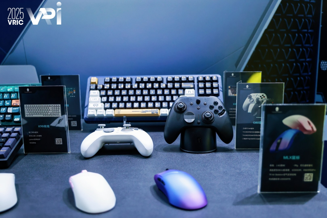 此外,雷神科技不仅面向XR客户,还面向众多“电竞爱好者”展示了多款最新外设,包括不同颜色的手柄,不同重量和形状的三模鼠标,以及酷炫的超透“海景房”机箱。无论你是电竞爱好者,还是对XR好奇的尝鲜客,都可以在雷神科技展台获得虚实交织的别致体验。
