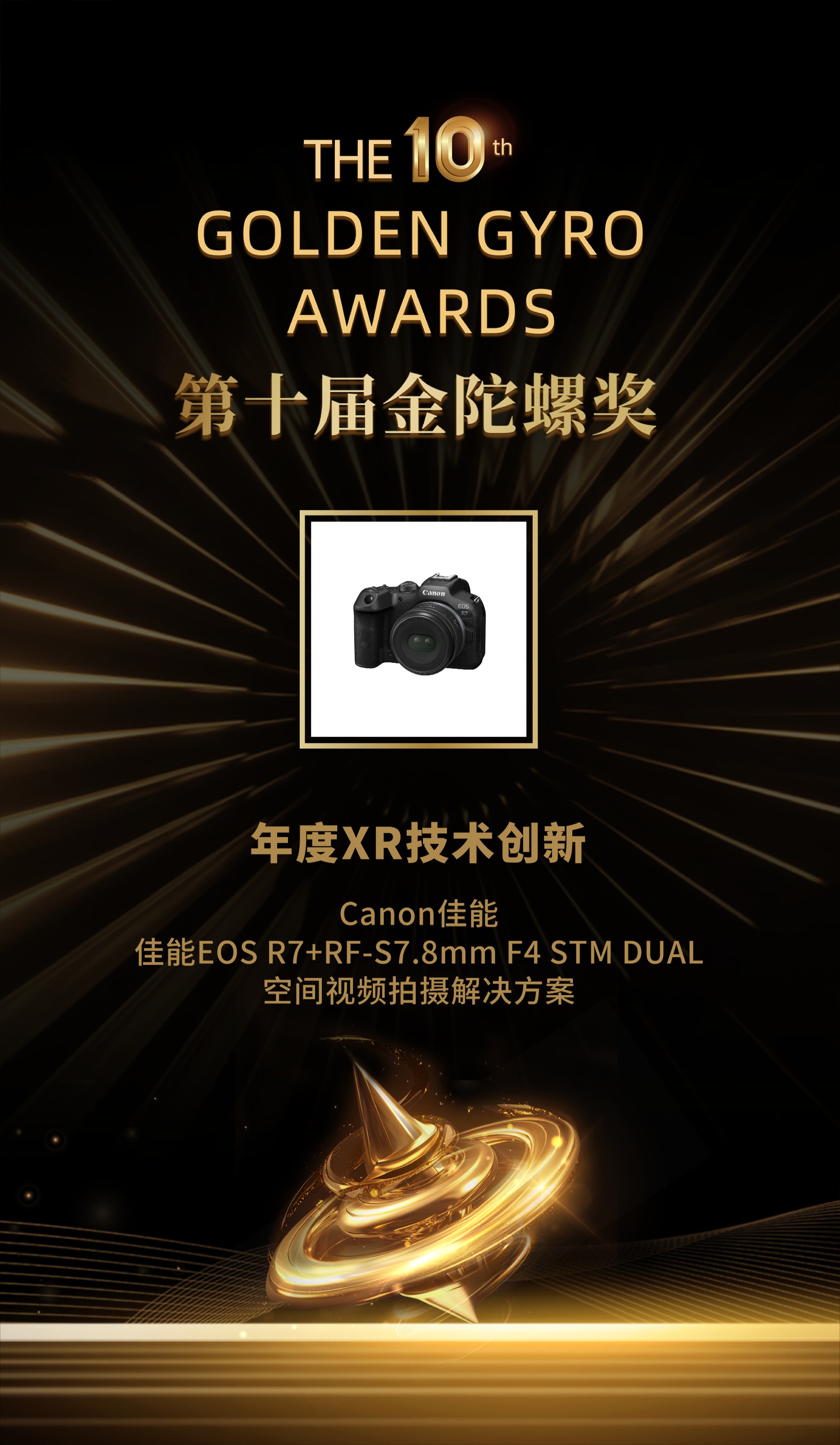 经历为期3个月的线上投票、专家评审,Canon佳能 佳能EOS R7+RF-S7.8mm F4 STM DUAL 空间视频拍摄解决方案 荣获第十届金陀螺奖“年度XR技术创新”。