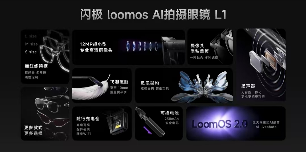 在硬件设计与佩戴体验方面,闪极loomos L1采用了细红线镜框,支持超轻量、3种尺码、10余款镜框选择,以及5种材质的柔性定制,飞羽镜腿窄至10mm重量更平衡。