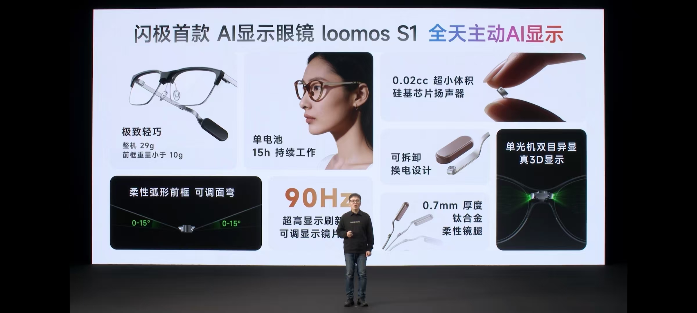与闪极L1对比,闪极S1则搭载「凤凰架构2.0」,首次实现显示眼镜前框的极致轻量化与可调曲度特性,闪极指出「闪极AI显示眼镜不是为了娱乐,而是为了把主动AI提醒戴在眼前」。