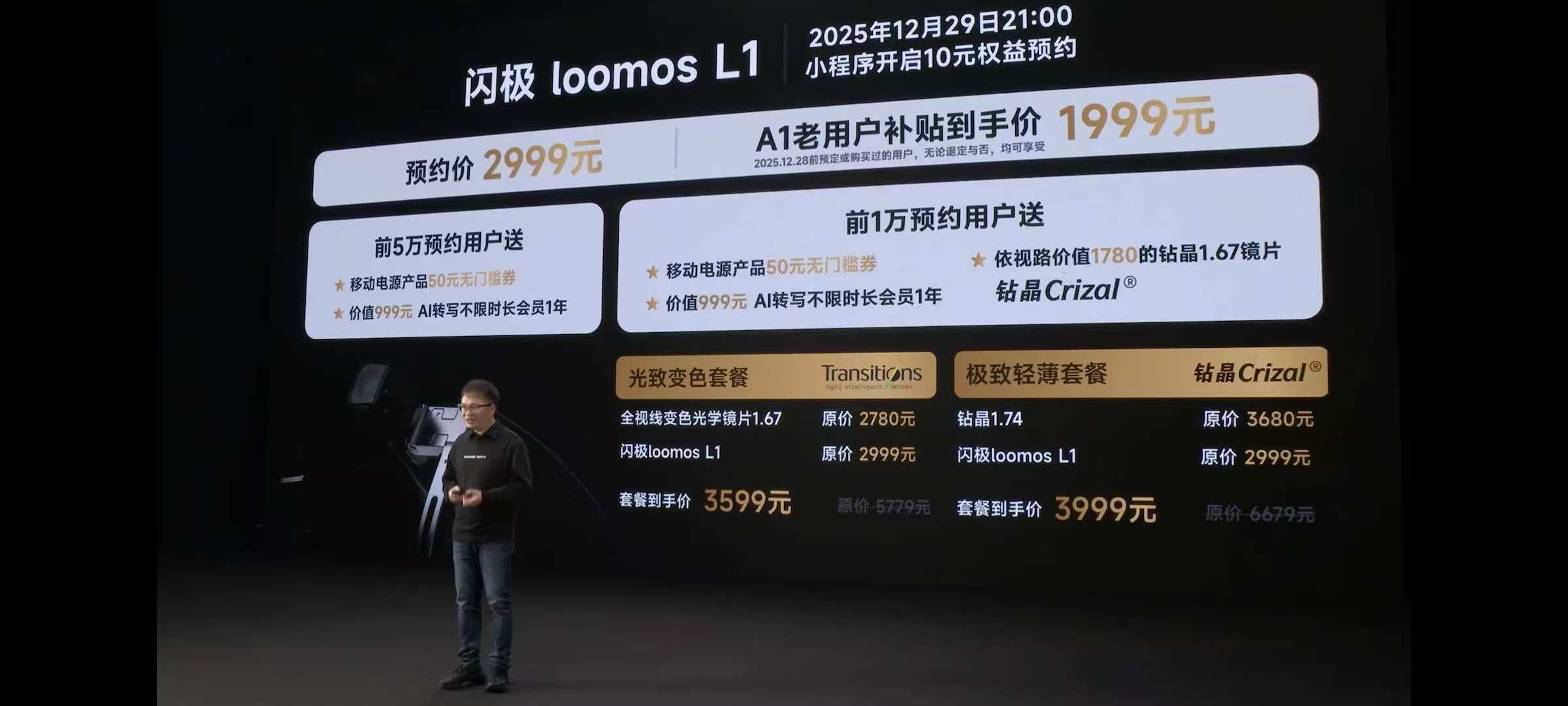 关于本次发布的两款设备的价格,闪极带来了多款方案,闪极loomos L1的预约价为2999元起(A1老用户补贴到手价1999元),前5万和前1万预约用户可分别享受多项赠送权益,用户可选择光致变色套餐(3599元)或极致轻薄套餐(3999元)的定制化配镜方案。