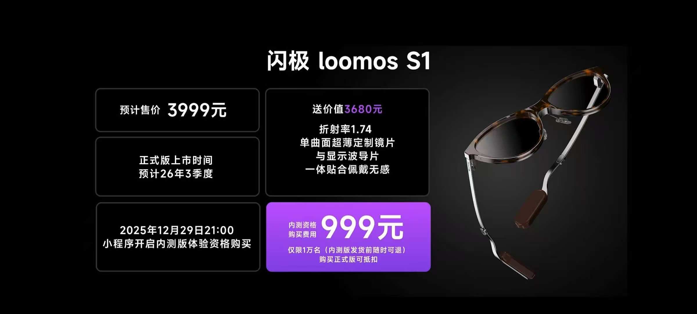 闪极loomos S1预计售价为3999元,搭配单曲面超薄定制镜片与显示波导片,一体贴合实现佩戴无感。预计于2026年三季度上市,内测资格购买费用为999元,名额仅限1万名。
