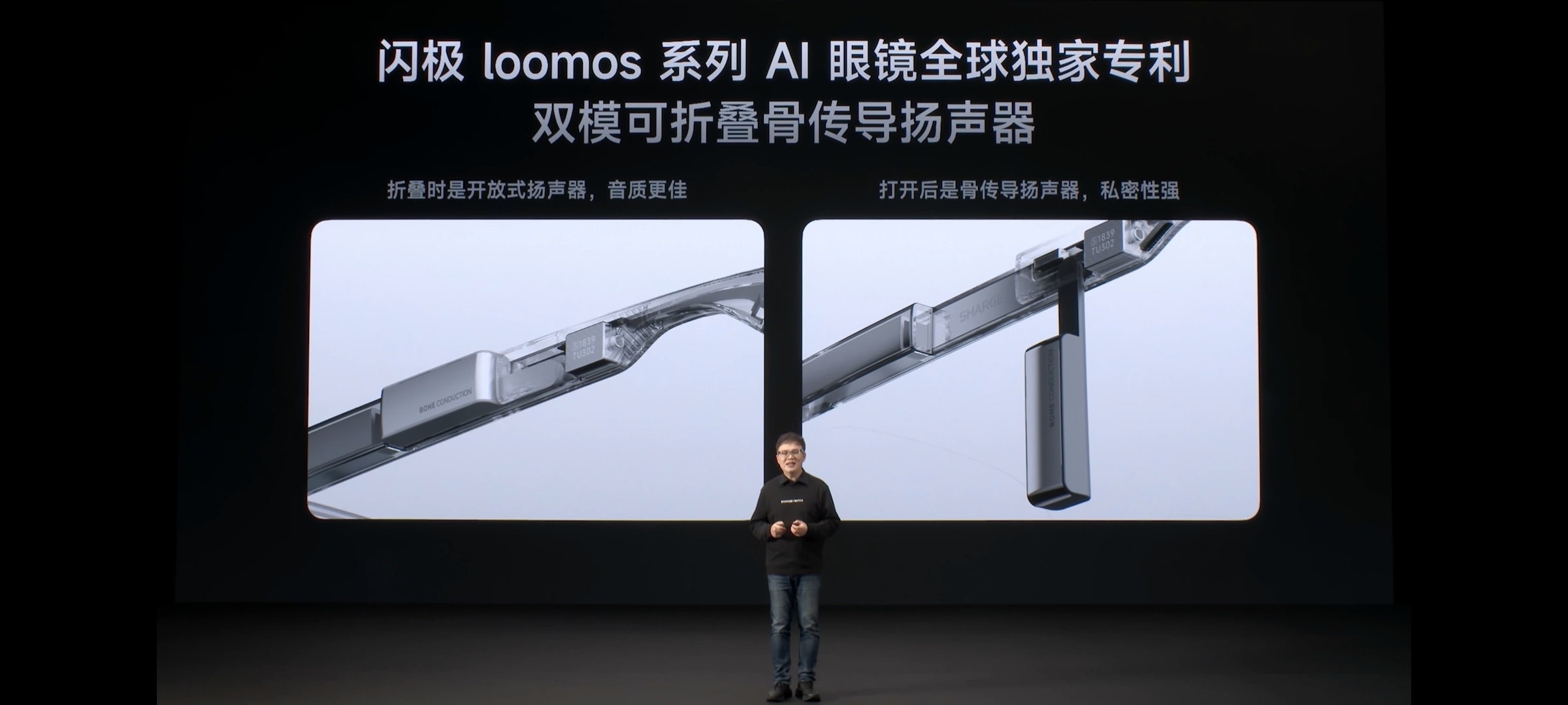 不仅如此,闪极还公布了两项技术创新成就。一是闪极全球独家专利的双模可折叠骨传导扬声器,彻底解决了AI眼镜的漏音和在嘈杂环境下音量不够大的问题。两者合并的时候是一个气传导的开放扬声器,适合户外使用;打开后贴近耳边,则是一个私密的骨传导扬声器,适合在任何场合使用。