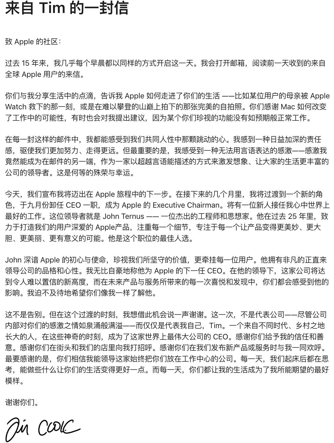 以下是来自库克发布于 Apple 社区的原文: