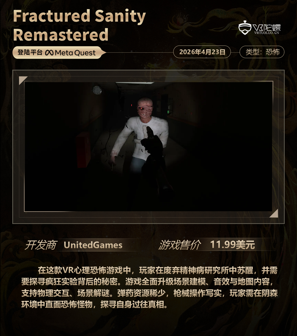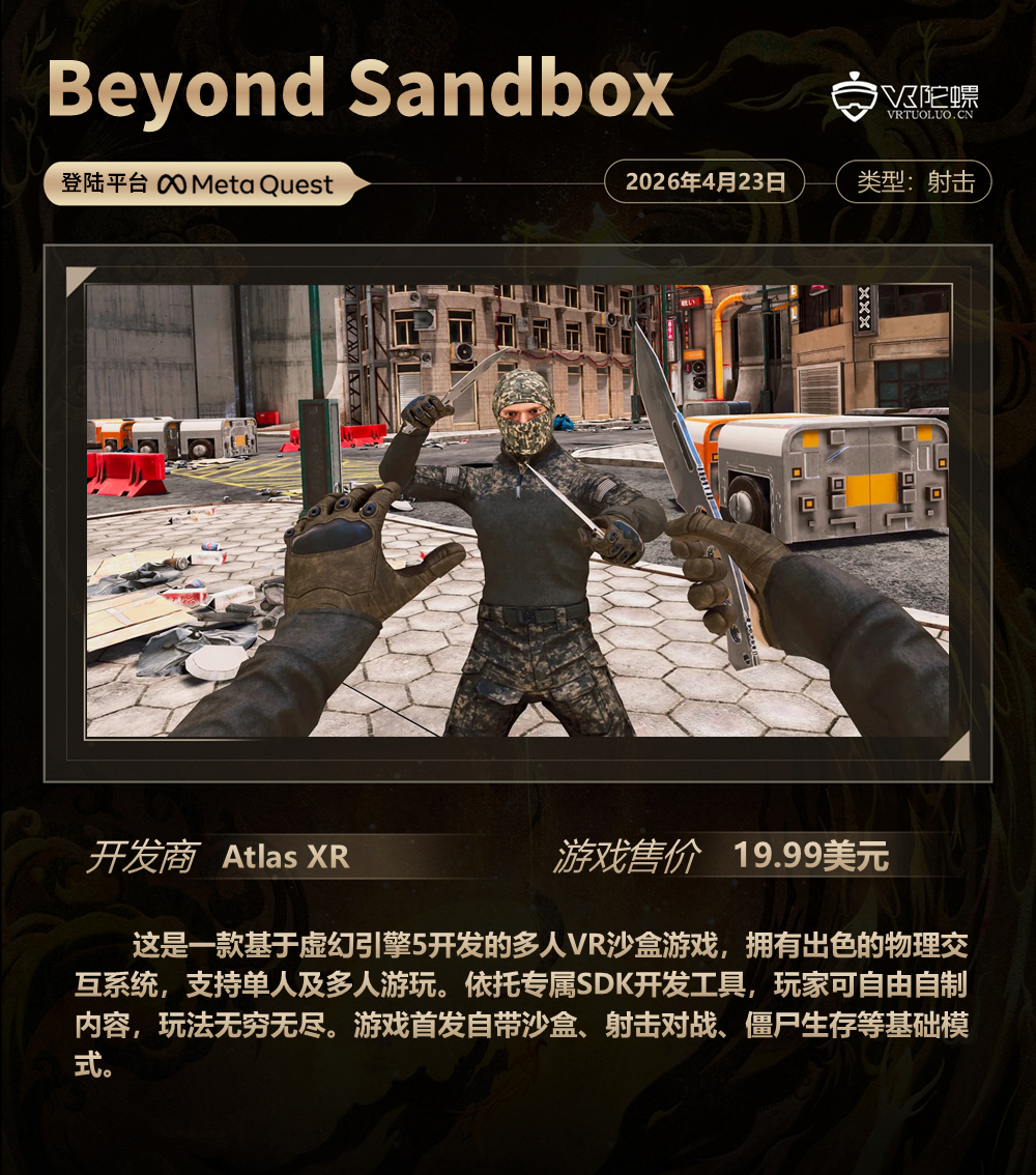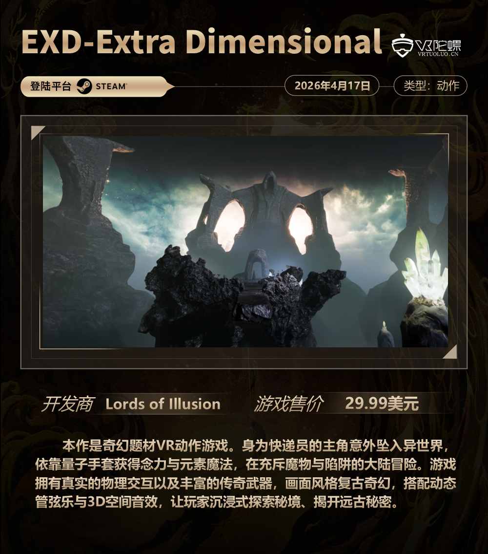 VR游戏周报·第189期,统计4月17日~4月23日期间上线的VR游戏,新作介绍共计5款,后文按照发售时间排序。截至2026年4月23日,各主要VR平台的内容数量如下: