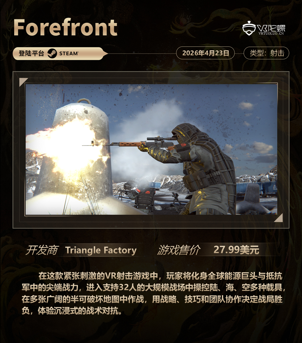 新作方面,2025年上线的恐怖游戏《玩具熊的五夜惊魂:模仿者的秘密》将新增VR游玩支持,并于4月28日登陆PS VR2与SteamVR平台。另一款VR FPS游戏《Forefront》已于4月23日上线正式版,在这款紧张刺激游戏中,玩家将进入支持32人的大规模战场中,用战略、技巧和团队协作决定战局胜负,体验沉浸式的战术对抗。