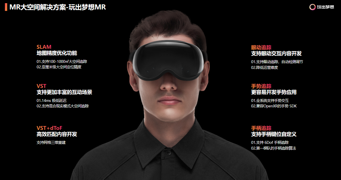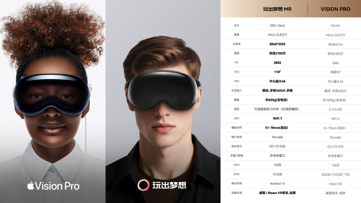先介绍下我们公司基本情况方面,我们比较特殊,背靠资金雄厚的集团公司,创始人黄锋以非常前瞻的眼光进行了大规模战略投入。因此我们至今几乎没有对外融资,完全依靠自有资金运营,并已推出三代产品。这或许在行业内算是一个「另类」,但也正体现出团队对这个方向以及终极用户体验的执着与坚持。我们推出的第三代产品「玩出梦想」MR对标了Vision Pro(AVP),不妨做个比较。