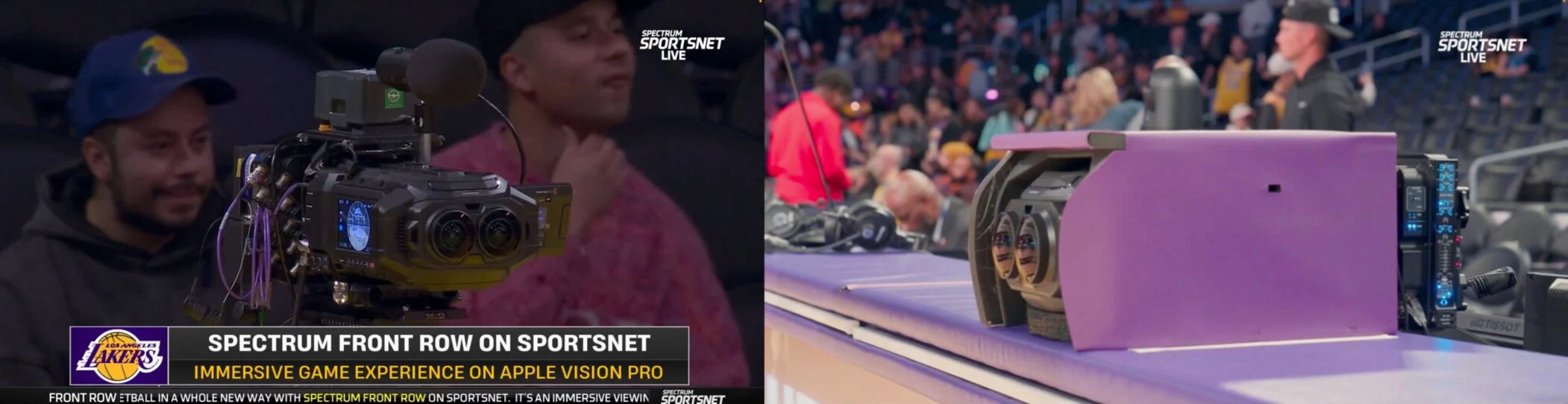 有了Vision Pro,用户就能拥有最佳观赛位置,主要在球场边线。用户没有切换摄像机角度的功能,镜头画面由导演调度。苹果在体育场内各处都架设了多台最新的Blackmagic URSA Cine沉浸式摄像机,目前苹果使用了七台摄像机:三台位于球场上,两篮筐后方各一台,记分台上一台(即中场摄像机),还有一台便携式可移动摄像机。