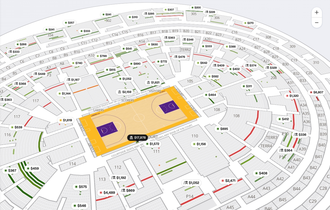 对比线下比赛,关于观赛成本的讨论就更加直接了。以湖人队为例,常规赛场边座位通常起价在在5500美元至8500美元之间,顶级比赛的门票价格超过2万美元,有些场次的场边票价甚至能炒到10万美元。