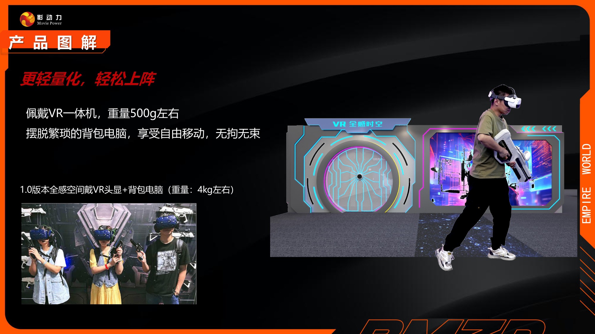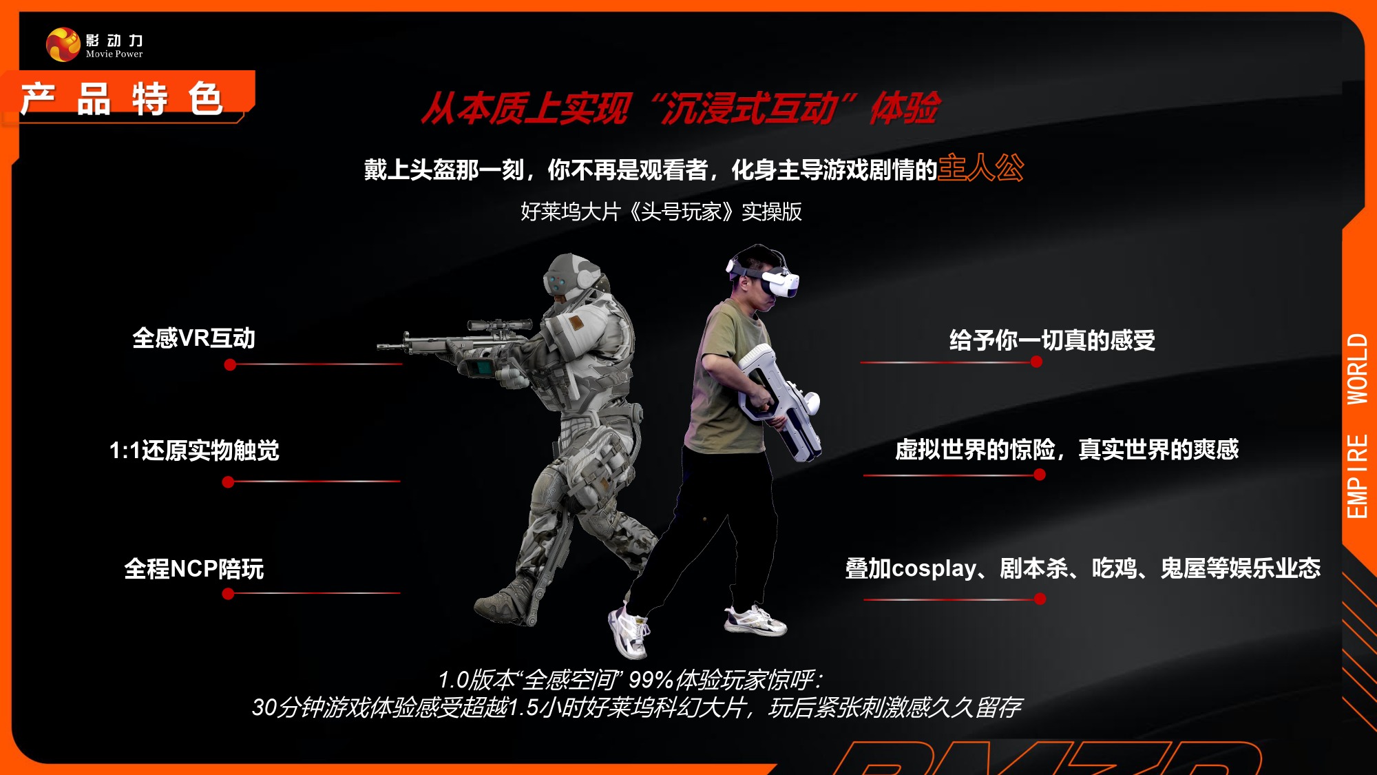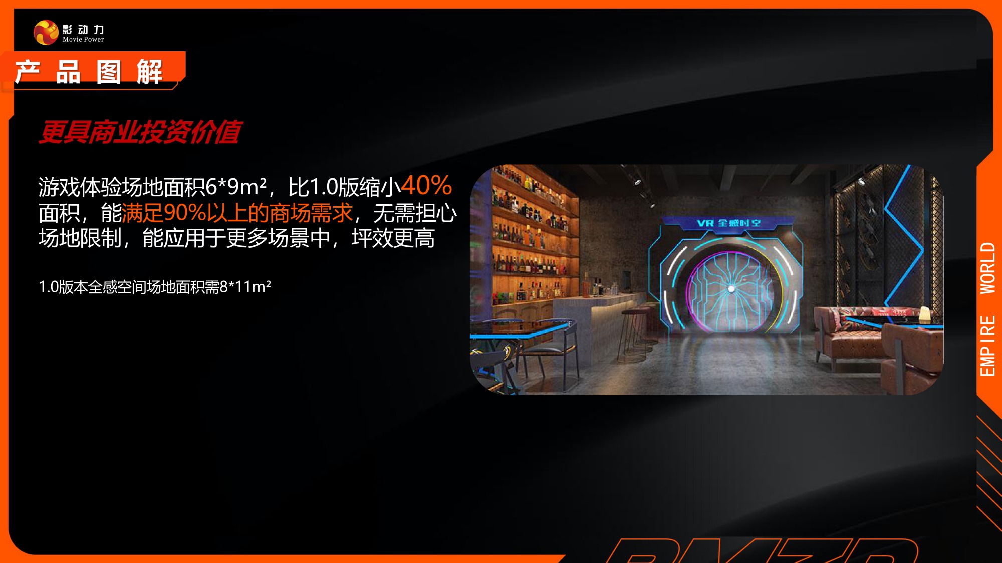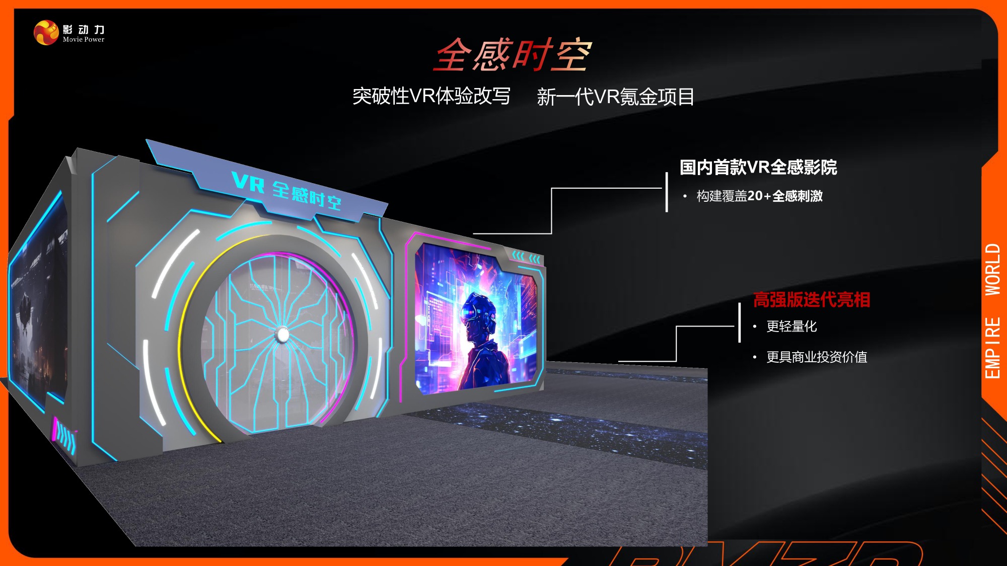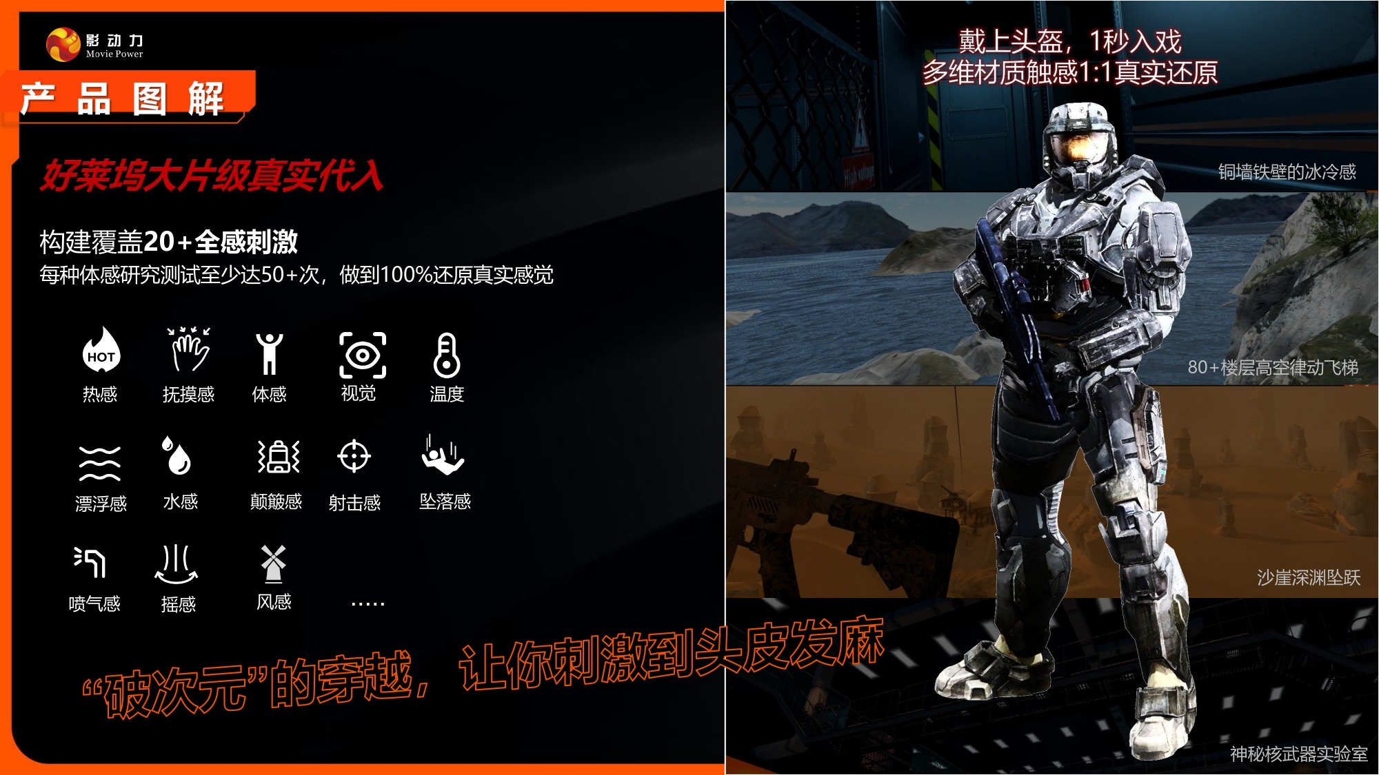 行业独家全感VR影院体验,突破VR体验瓶颈的二次元新项目。体验过程中1:1还原实物反馈,更具备多重特效,有热感,触摸感,体感,视觉,温度,悬浮感,喷水感,互动射击。配合高精度军工级别定位技术系统,让实物触感跟影片同步,所见即所得,全方位全感沉浸式真实体验。仅60平方即可开店,不在被场地受限,能应用到更多的商业场景中,坪效更高,是新一代引流首选设备。